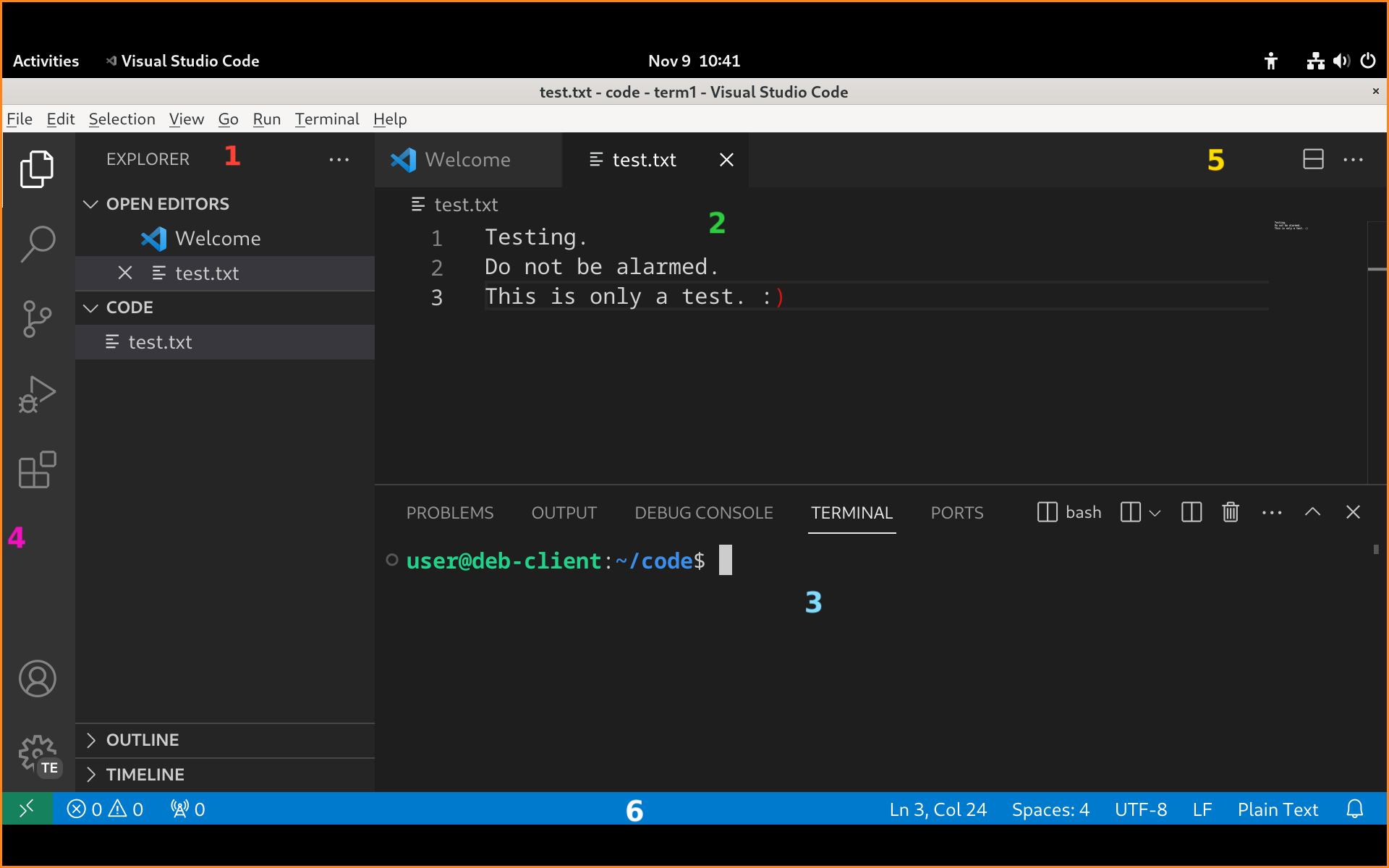 There are several components that make up the entire VS Code window. Take a look at the following figure and we'll describe each numbered component.