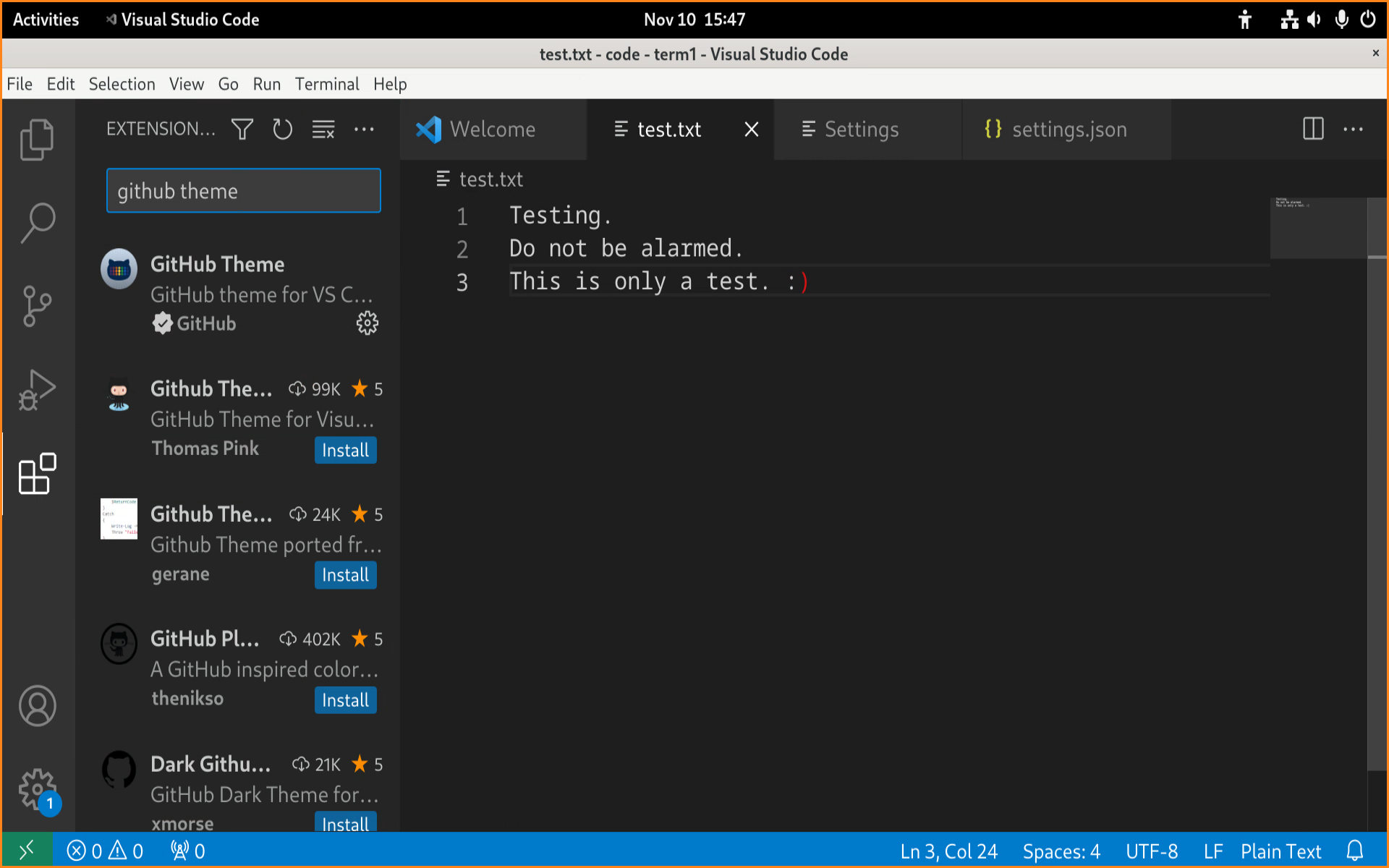 This will list the currently installed extensions (if any). You can also search for extensions right here. For example, in Figure 7 I searched for the GitHub Theme.