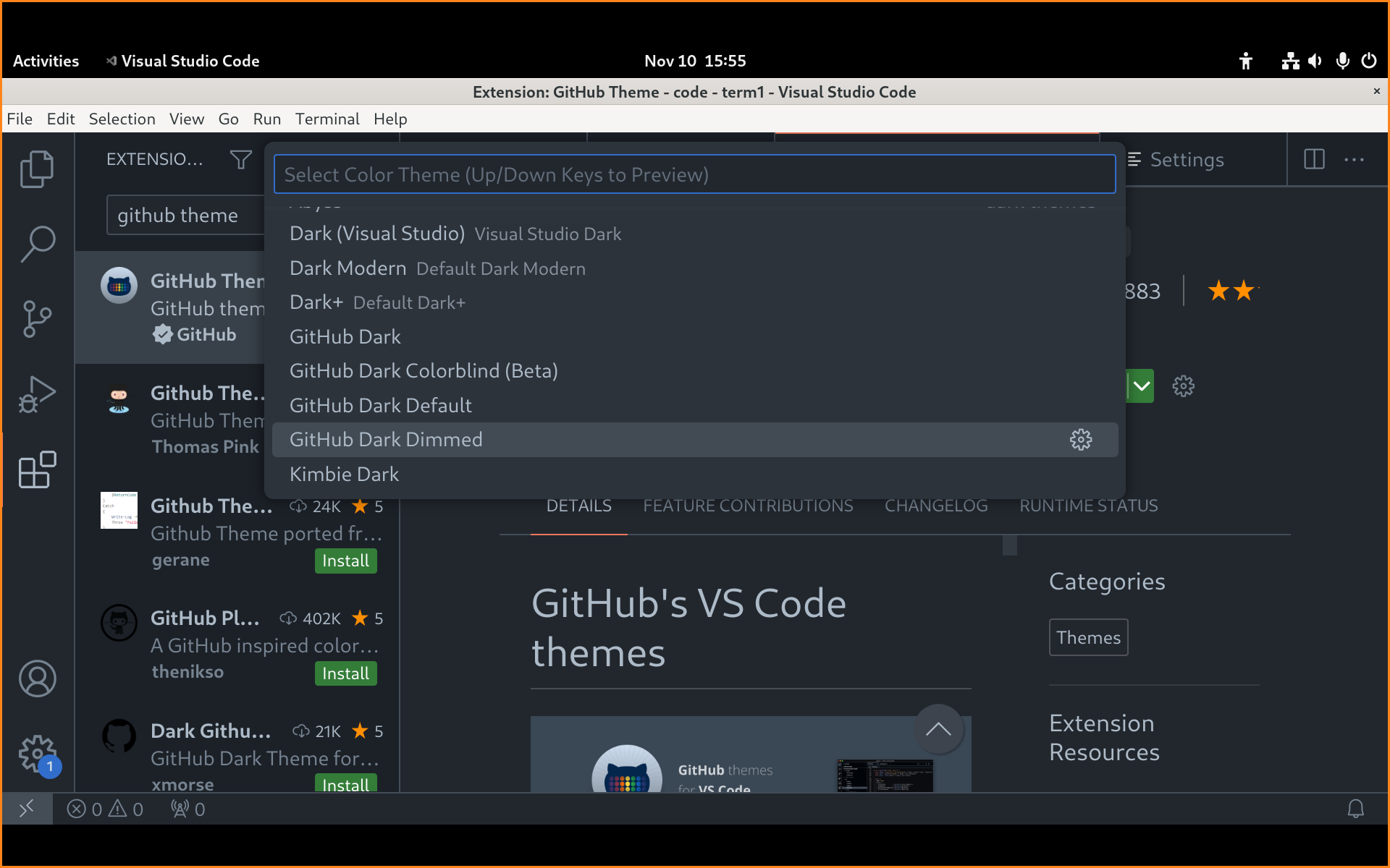 In this case, I see that the first one listed is from GitHub. We can click it to find out more about the extension and to confirm the officiality of the theme. It displays this information as a tab in the Editor Panel.