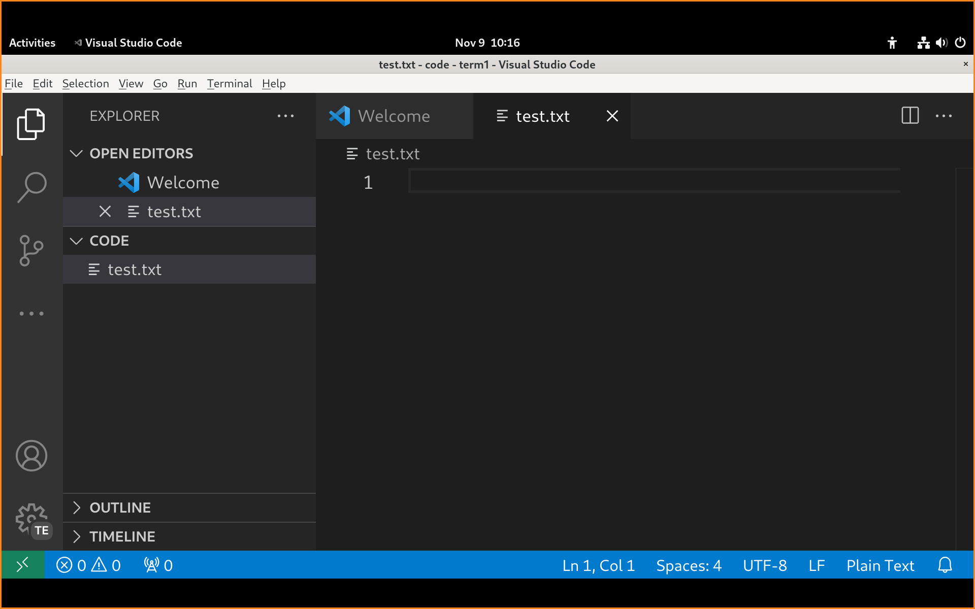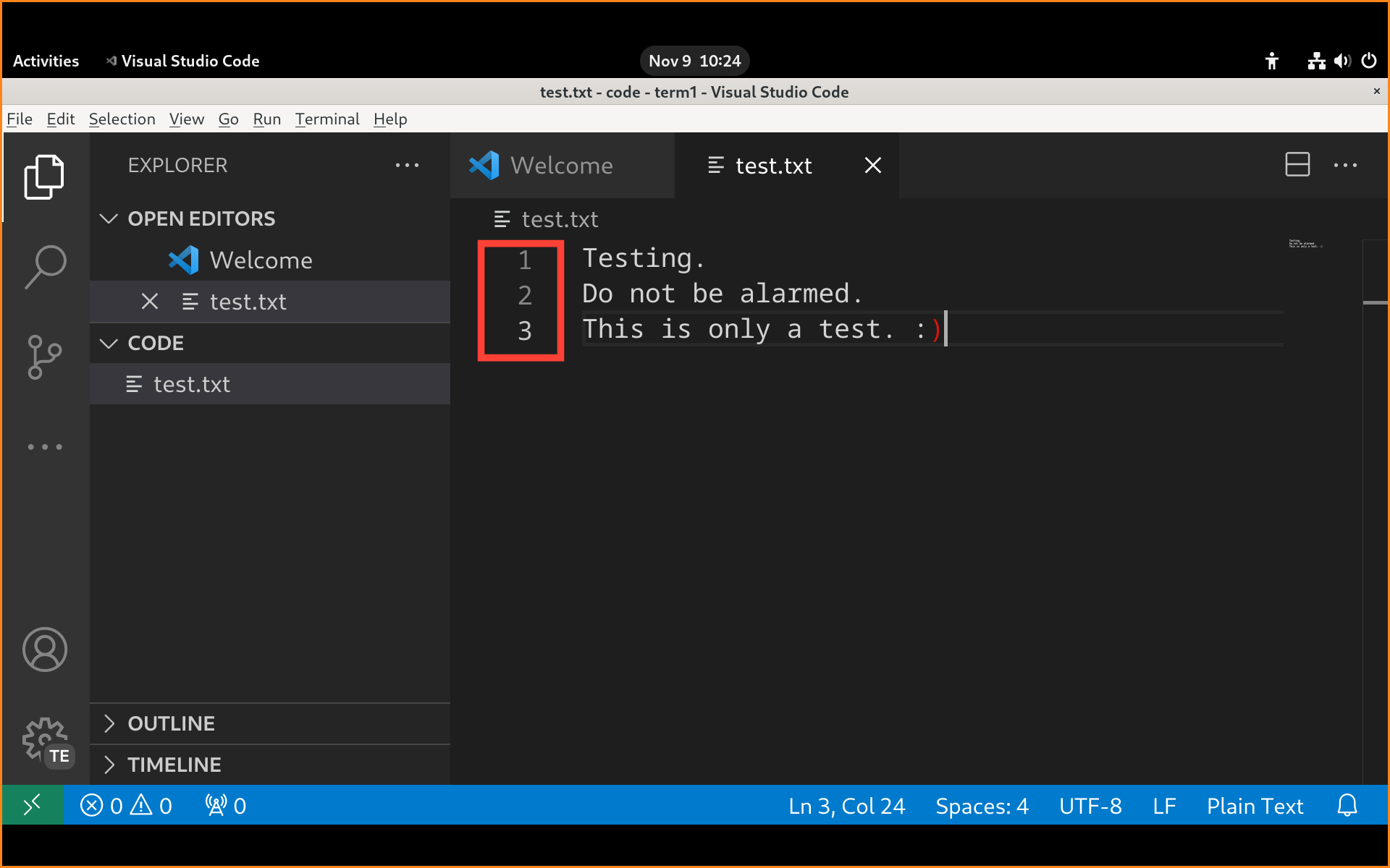 The Editor panel is now opened for "test.txt". Go ahead and type some text! You will find that line numbering is turned on by default as shown in the following figure: