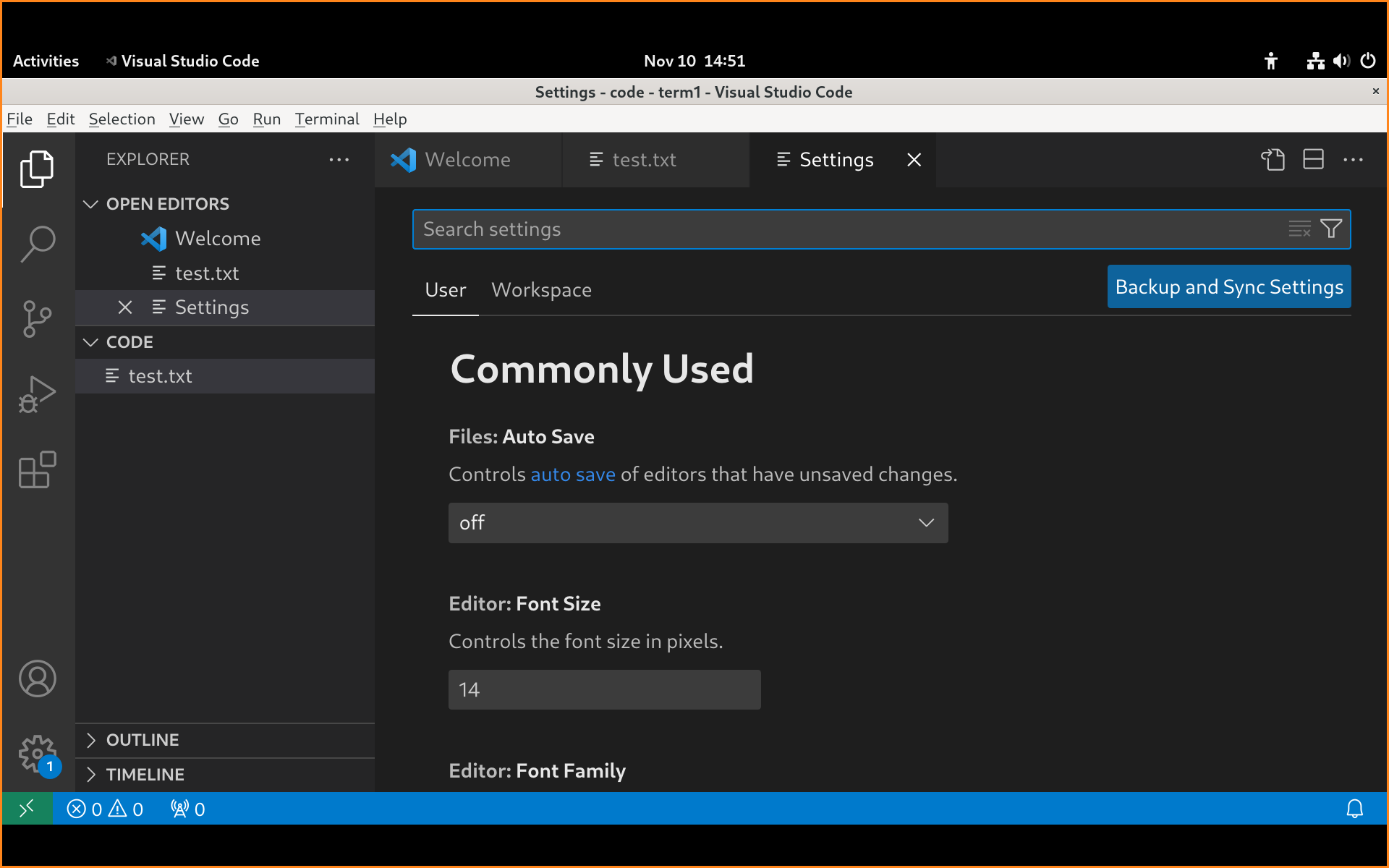 So far so good. But you will no doubt want to configure VS Code your way. Enter in Settings. You can access Settings by: