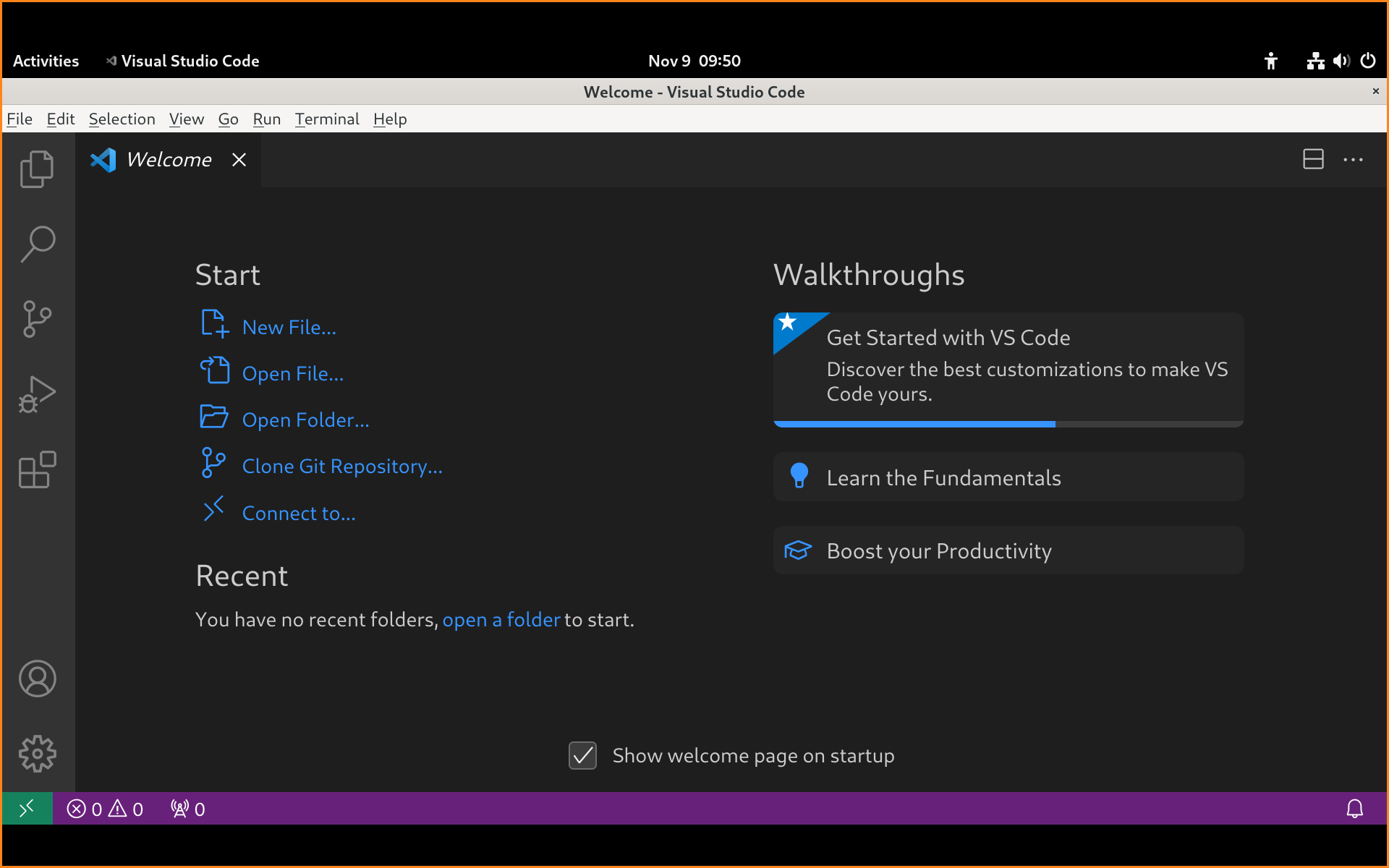 At this point, you can start coding immediately with a new file, open a pre-existing file or folder, clone a repository, or connect to another system, container, or codespace.