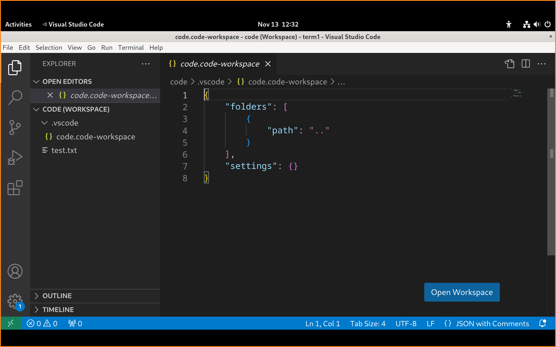 In the figure, you can see the code.code-workspace json file that I saved within the hidden .vscode directory. The file is devoid of any real configurations but we can modify that.