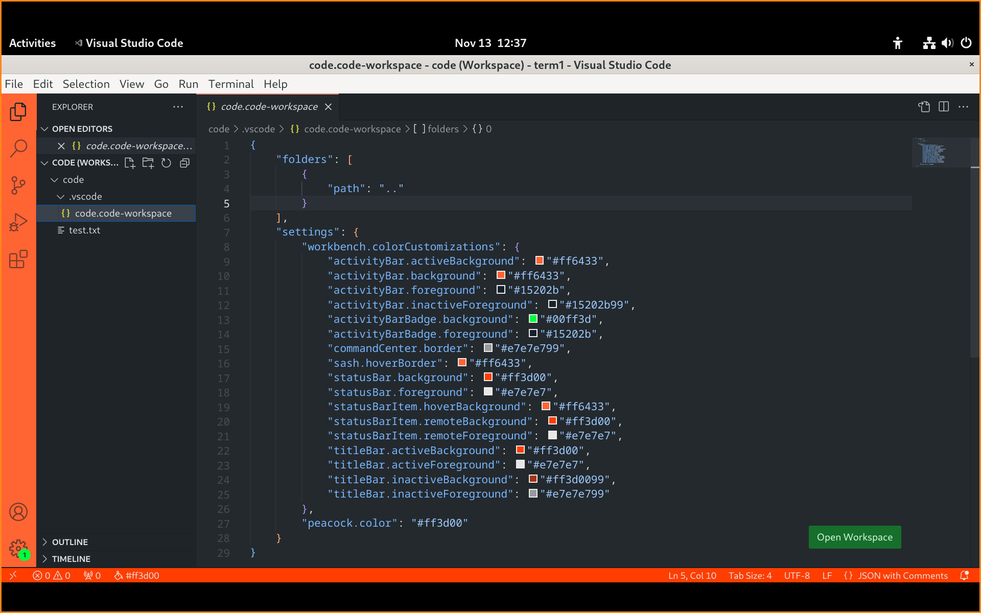 Now, every time I open this workspace, VS Code will read the code.code-workspace JSON file and apply the settings that are within, modifying the colors as shown in Figure 11. And that's just the beginning, you can modify all kinds of settings and save them to the particular workspace so that they don't affect other workspaces. If you are working on multiple developing projects, this can be extremely helpful.